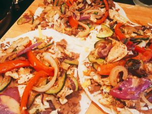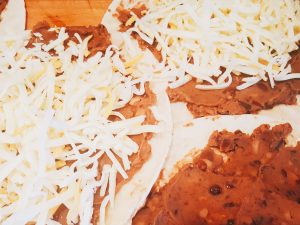Lay out the tortillas and spread with refried beans. Top with cheese and veggie-chicken filling when it’s finished cooking.